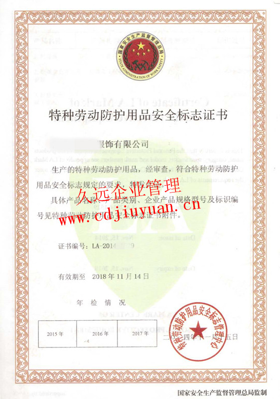 勞動防護(hù)用品安全標(biāo)志認(rèn)證證書