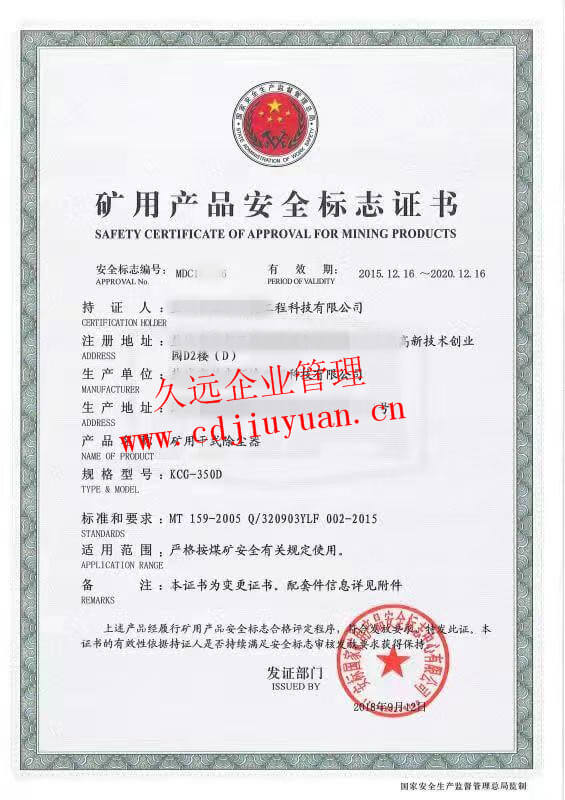 礦用產(chǎn)品安全標(biāo)志認(rèn)證證書